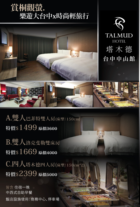 只要1499元起,即可享有【塔木德連鎖飯店集團-中山館】賞桐觀螢.樂遊大台中x時尚輕旅行AB.雙人/C.四人方案〈含A.巴菲特雙人房/B.洛克斐勒雙床房/C.塔木德四人房 住宿一晚 + 中西式自助早餐 + 飯店設施使用:商務中心、停車場〉