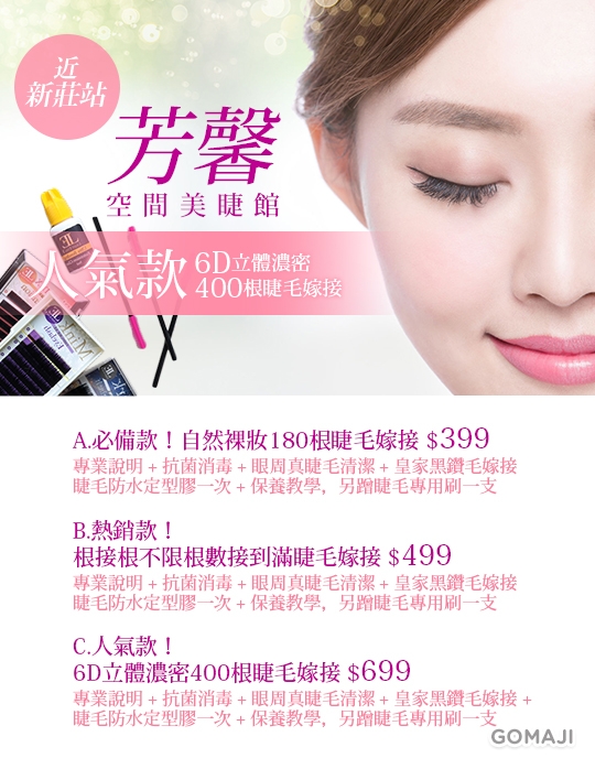 只要399元起,即可享有【芳馨空間美睫館】A.必備款!自然裸妝180根睫毛嫁接 / B.熱銷款!根接根不限根數接到滿睫毛嫁接 / C.人氣款!6D立體濃密400根睫毛嫁接