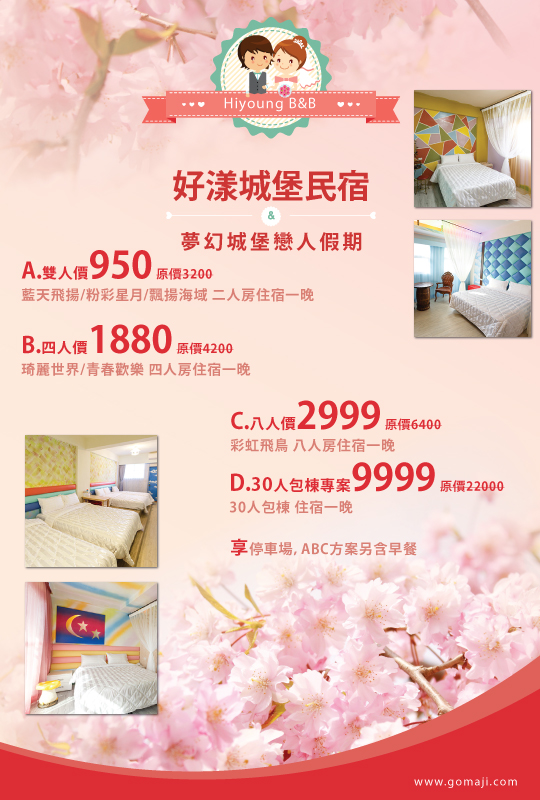只要950元起,即可享有【墾丁-好漾城堡民宿】夢幻城堡戀人假期A.雙人/B.四人/C.八人/D.30人包棟方案〈含A.(藍天飛揚/粉彩星月/飄揚海域雙人房)/B.(琦麗世界/青春歡樂四人房)/C.彩虹飛鳥八人房/D.30人包棟 住宿一晚 + 停車場,ABC方案另含早餐〉