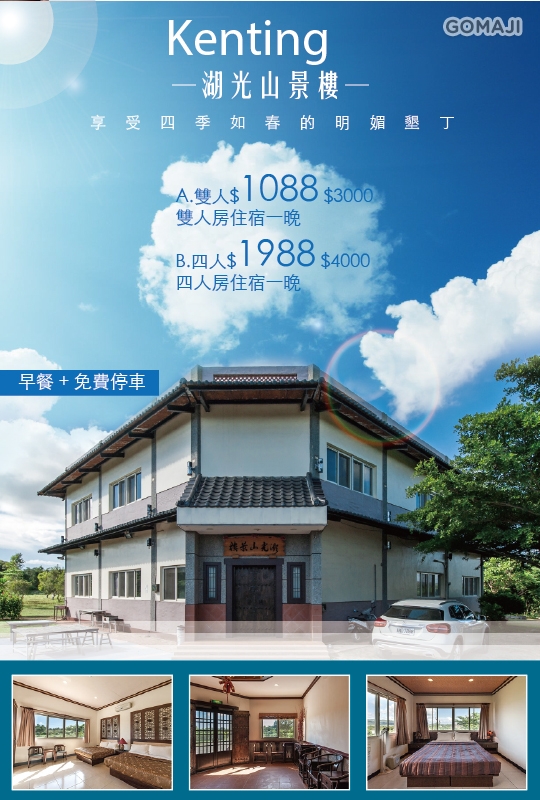 只要1050元起,即可享有【墾丁-湖光山景樓】享受四季如春的明媚墾丁雙人/四人住宿專案〈A.雙人房 / B.四人房 住宿一晚 + 早餐 + 免費停車〉
