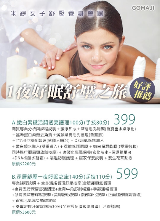只要399元起,即可享有【米緹女子舒壓養身會館】A.嫩白緊緻活顏透亮護理100分(手技80分) / B.深層舒壓一夜好眠之旅140分(手技110分)