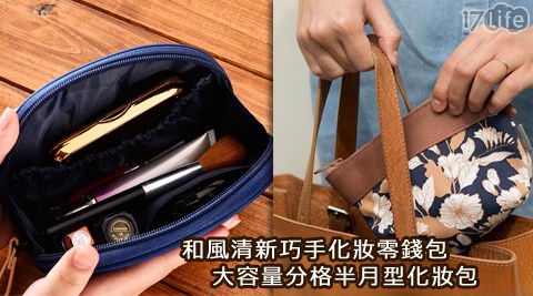 17Life 宅配 和風清新巧手化妝零錢包/大容量分格半月型化妝包”