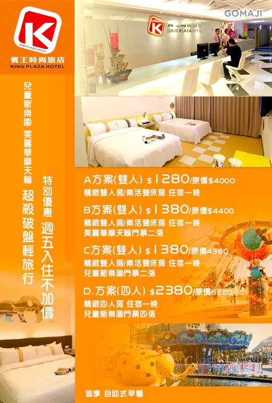 只要1280元起,即可享有【台北-賓王時尚旅店 KING PLAZA HOTEL】週五入住不加價!暑假超殺住宿專案〈含ABC.(精緻雙人房/樂活雙床房)/D.精緻四人房 住宿一晚 + 自助式早餐,B方案另含美麗華摩天輪門票二張,CD方案另含兒童新樂園門票〉特別優惠:週五入住不加價