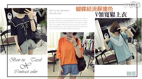 17Life 宅配 韓版蝴蝶結流蘇撞色V領寬鬆上衣”