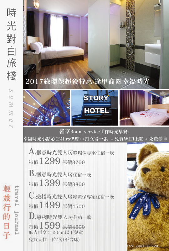 只要1299元起,即可享有【台中逢甲-時光對白旅棧】2017綠環保超殺特惠·逢甲商圈幸福時光雙人住宿方案〈含AB.愜意時光雙人房/CD.戀棧時光雙人房 住宿一晚 + Room service手作時光早餐 + 幸福時光小點心(24hrs供應) + 拍立得一張 + 免費WIFI上網 + 免費停車場〉