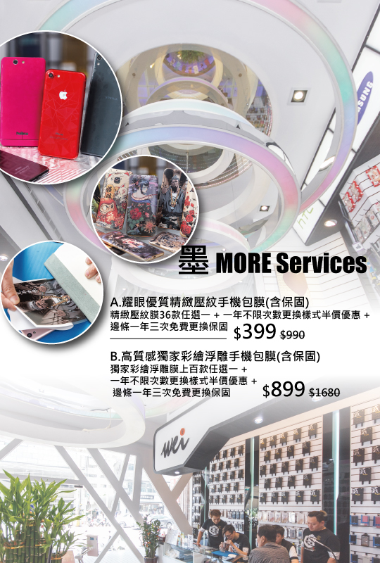 只要399元起,即可享有【墨 MORE Services】A.耀眼優質精緻壓紋手機包膜(含保固) / B.高質感獨家彩繪浮雕手機包膜(含保固)