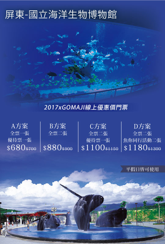 只要680元起,即可享有【屏東-國立海洋生物博物館】2017 X GOMAJI線上優惠價門票~平假日皆可使用ABCD方案〈含A.全票一張+優待門票一張 / B.全票二張 / C.全票二張+優待門票一張 / D.全票二張+魚你同行活動二名〉