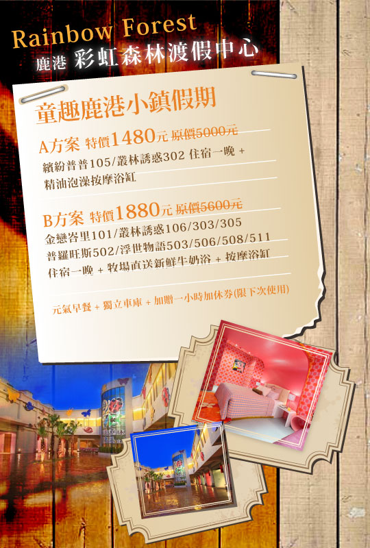 【鹿港-彩虹森林】多樣主題房型等您來體驗!B方案另享新鮮牛奶浴,貼心呵護您!鹿港小鎮歡樂假期,道地美食呷透透!暢遊彰化鹿港的第一選擇!