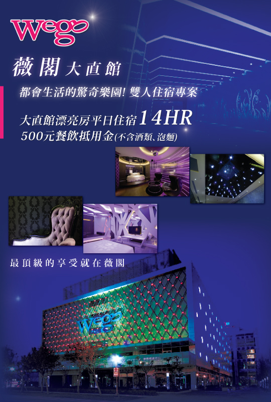 只要2580元,即可享有【Wego薇閣精品旅館-大直旗艦館】都會生活的驚奇樂園! 雙人住宿專案〈含大直館漂亮房平日住宿14HR + 500元餐飲抵用金(不含酒類、泡麵)〉